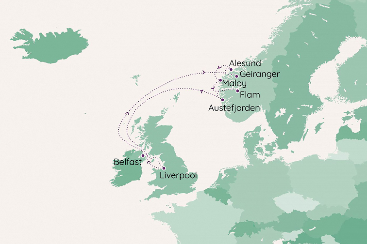 After crossing the Irish Sea to the thriving city of Belfast, which has long sloughed off its troubled past, you will enjoy a relaxing day at sea enroute to Norway in search of the unforgettable Midnight Sun. First you will cruise the magnificent Geirangerfjord and then explore Ålesund, steeped in Viking culture and famed as the country’s most beautiful city. Your next port of call will be charming Måløy on the island of Vågsøy before taking in the delightful village of Flam and cruising the Sognefjord and Aurlandsfjord, which will take your breath away with their unrivalled scenery.