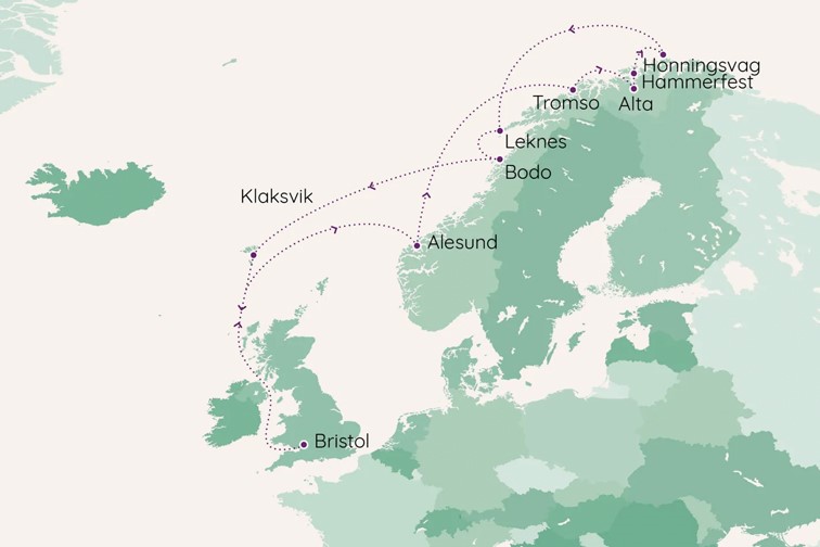 Three days at sea to relax and unwind will be the prelude to the Arctic adventure of a lifetime. First we will enjoy Ålesund, Norway’s most beautiful city, before another day at sea takes us to tranquil Tromsø – one of the best places in the world to see both the Midnight Sun and the Northern Lights. After visits to Alta, with its famous rock carvings, the world’s most northerly city of Hammerfest, and Honningsvåg for Europe’s northernmost point of North Cape, we will continue our exploration of the Arctic Circle in Leknes, set against lofty mountains and salt white beaches. Bidding farewell to Norway at the mini-metropolis of Bodø, we will sail southwards to Klaksvík, second largest town of the remote and unspoilt Faroe Islands, before returning to Bristol.
