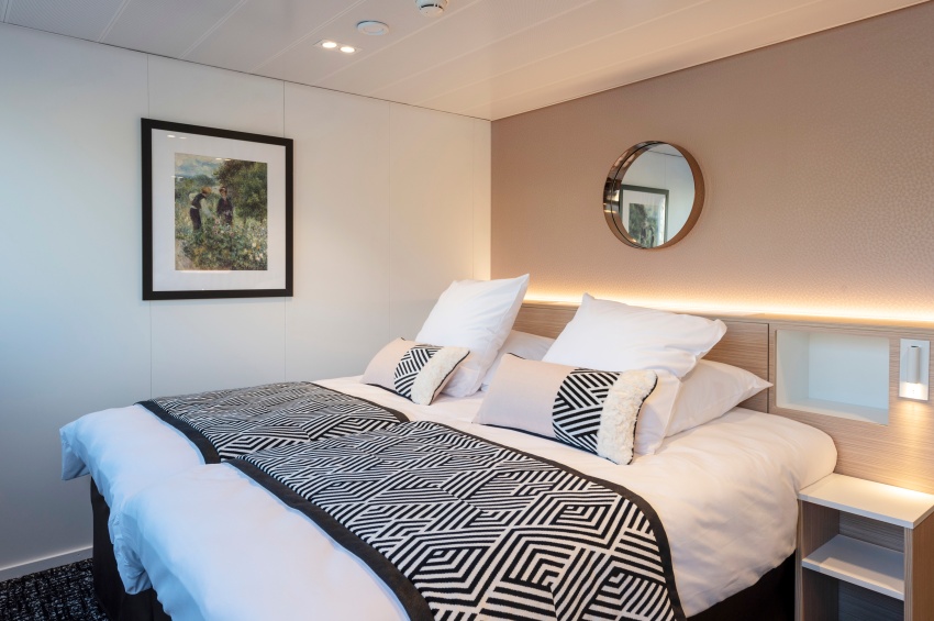 Spread over two decks, its 54 cabins accommodate 105 passengers.